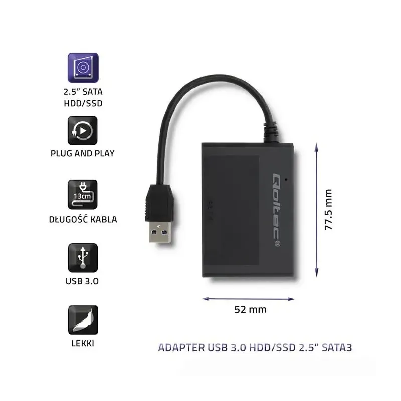 Obudowa Qoltec na dysk HDD/SSD 2.5" SATA3 | USB 3.0 | Czarna Obudowa Qoltec na dysk HDD/SSD 2.5" SATA3 | USB 3.0 | Czarna to obudowa na dysk. Umożliwia podłączenie dysku jako zewnętrznego nośnika danych.