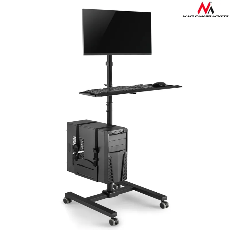 Stand, wózek, mobilne stanowisko komputerowe na kółkach Maclean MC-793 max to akcesorium komputerowe. Zwiększa funkcjonalność i komfort użytkowania komputera lub monitora.