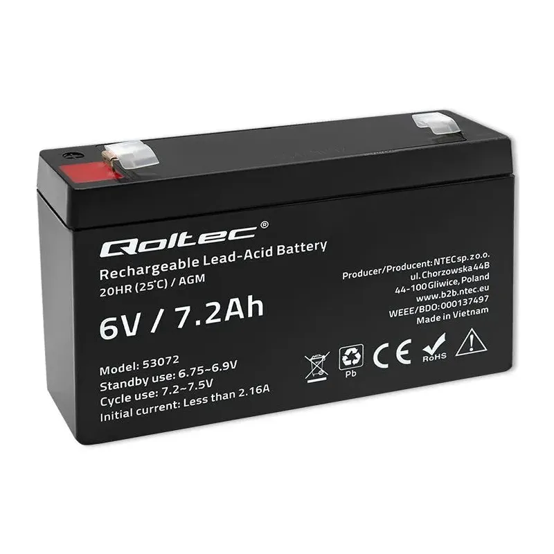 Akumulator AGM Qoltec 6V | 7.2Ah to produkt o pojemności 7200 mAh.