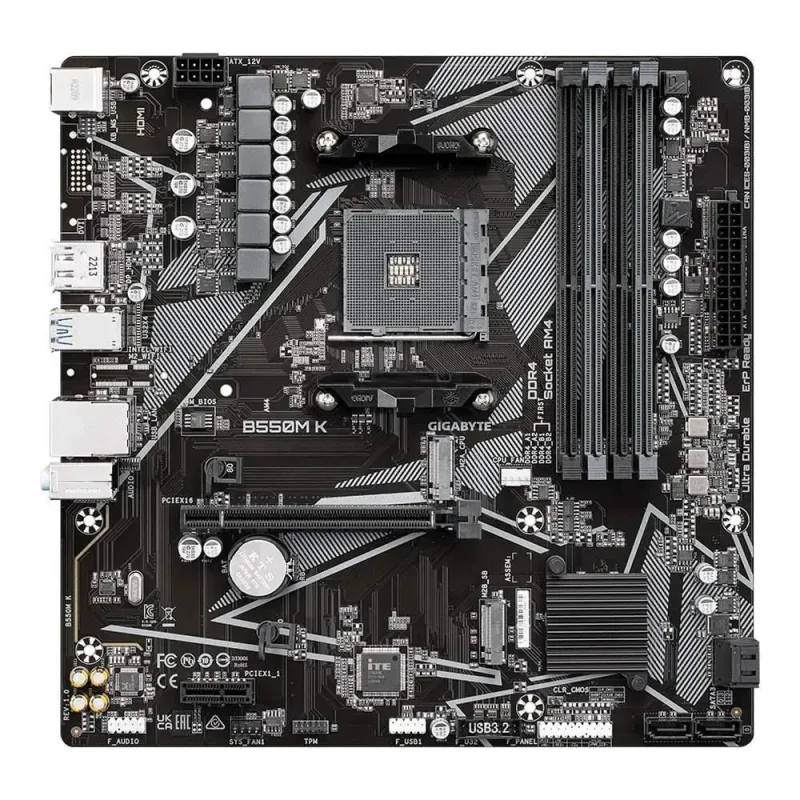 Płyta Gigabyte B550M K /AMD B550/DDR4/SATA3/M.2/USB3.0/PCIe4.0/AM4/mATX to płyta główna AMD AM4. Stanowi podstawę zestawu komputerowego z procesorami AMD Ryzen.