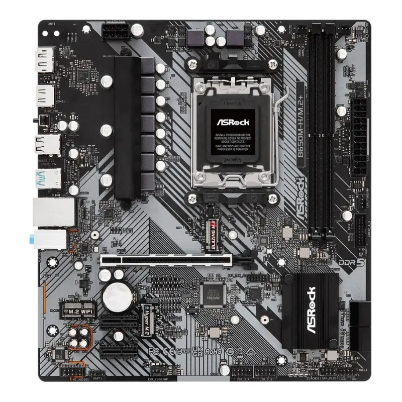 Płyta ASrock B650M-H/M.2+ /AMD B650/DDR5/SATA3/M.2/USB3.0/PCIe4.0/AM5/mATX to płyta główna AMD AM5. Stanowi podstawę zestawu komputerowego z procesorami AMD Ryzen 7000/9000.