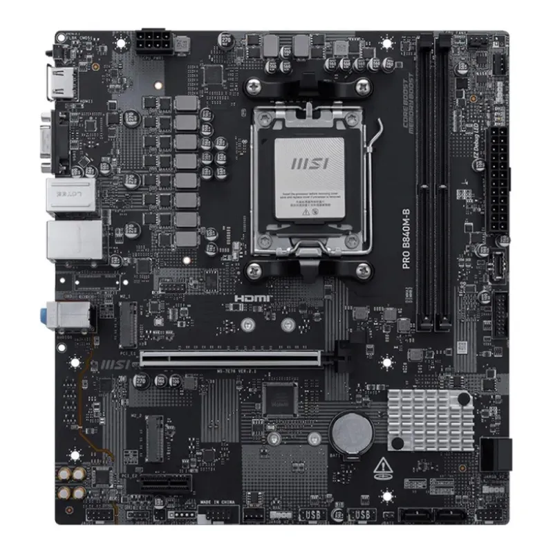 Płyta MSI PRO B840M-B /AMD B840/DDR5/SATA3/M.2/USB3.0/PCIe4.0/AM5/mATX to płyta główna AMD AM5. Stanowi podstawę zestawu komputerowego z procesorami AMD Ryzen 7000/9000.