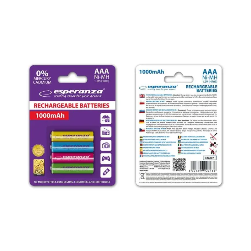 Akumulatorki AAA Esperanza 1000mAh 4szt. mix kolorów to bateria. Zapewnia zasilanie urządzeń przenośnych i elektronicznych.