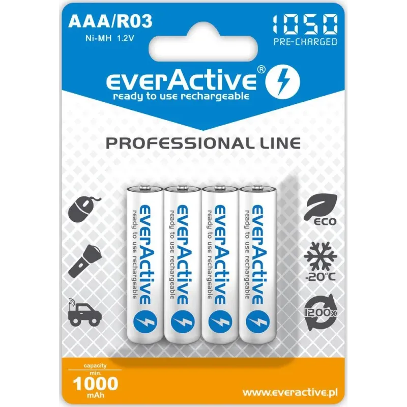 Akumulatorki AAA/R03 everActive Professional Line 1050 mAh 4 sztuki to bateria. Zapewnia zasilanie urządzeń przenośnych i elektronicznych.