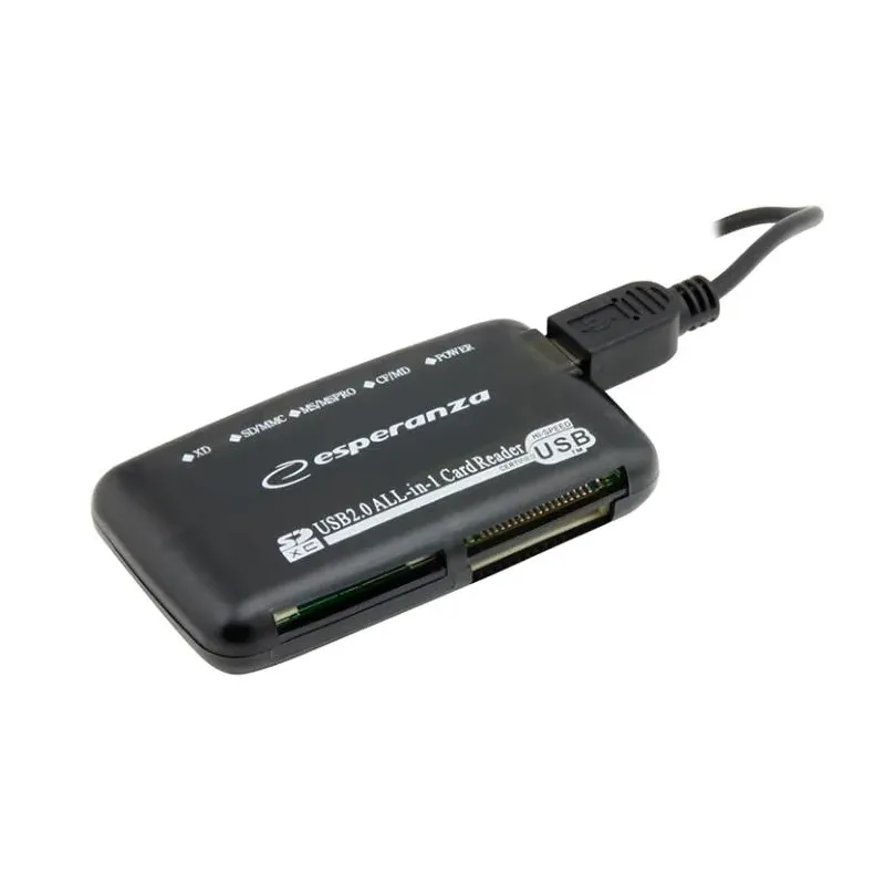 Uniwersalny czytnik Kart Pamięci Esperanza EA117 USB 2.0 to czytnik kart pamięci. Umożliwia odczyt kart SD, microSD i innych nośników.