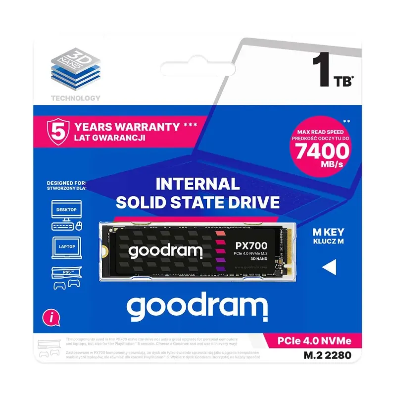 Dysk SSD GOODRAM PX700 1TB M.2 2280 PCIe NVMe (7400/6500 MB/s) RETAIL Dysk SSD GOODRAM PX700 1TB M.2 2280 PCIe NVMe (7400/6500 MB/s) RETAIL to dysk SSD o pojemności 1 TB. Zapewnia szybki dostęp do danych i krótki czas uruchamiania systemu.