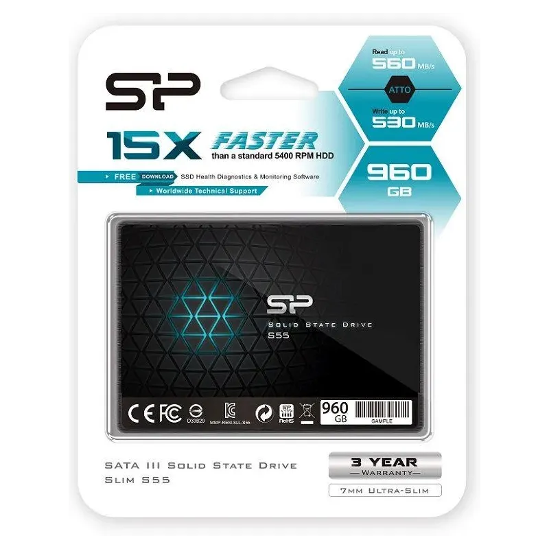 Dysk SSD Silicon Power S55 960GB 2.5" SATA3 (560/530) 7mm to dysk SSD o pojemności 960 GB. Zapewnia szybki dostęp do danych i krótki czas uruchamiania systemu.