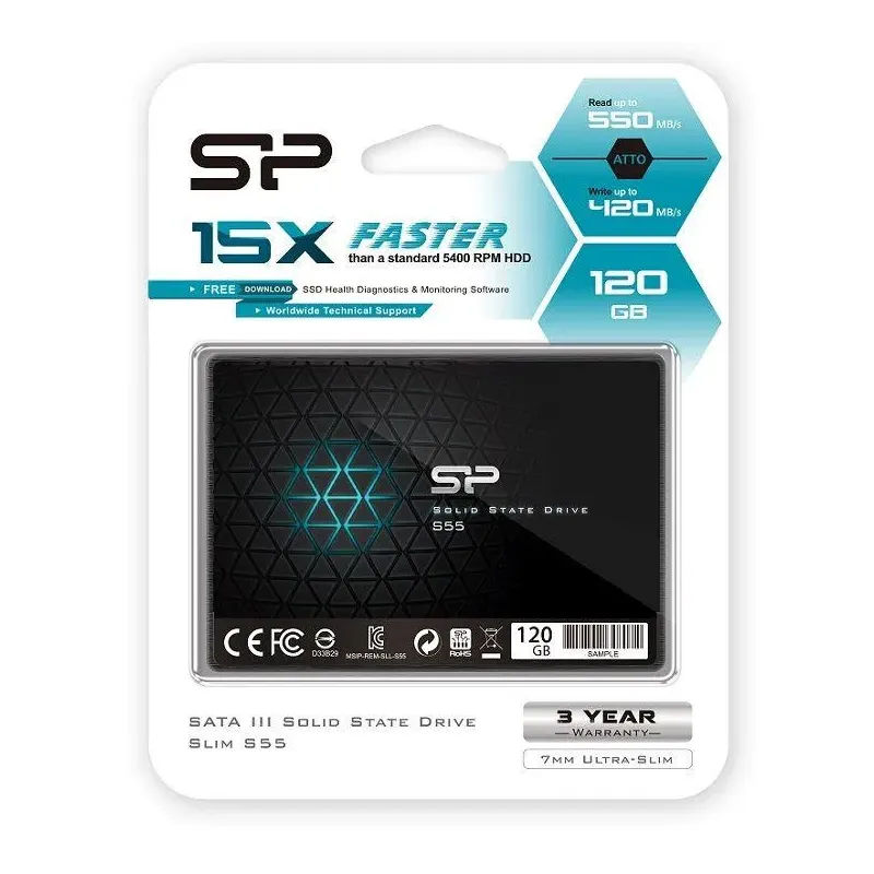 Dysk SSD Silicon Power S55 120GB 2.5" SATA3 (550/420 MB/s) 7mm to dysk SSD o pojemności 120 GB. Zapewnia szybki dostęp do danych i krótki czas uruchamiania systemu.