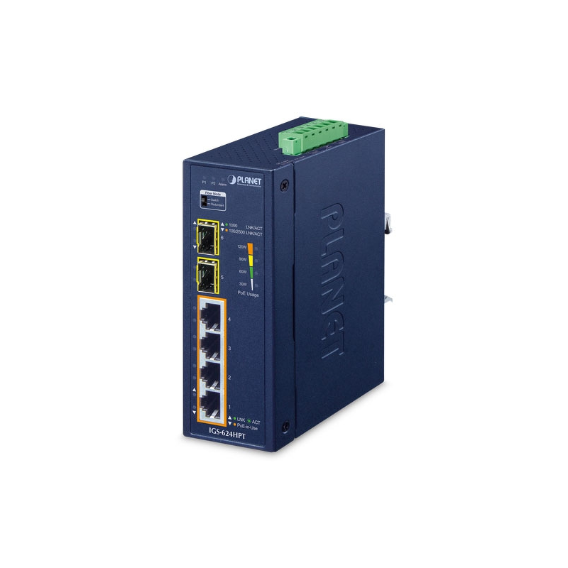 IGS-624HPT to przełącznik Gigabit Ethernet PoE+ typu przemysłowego PLANET, przeznaczony do montażu na szynie DIN, który wyróżnia się funkcją Plug and Play i jest przeznaczony do instalacji w trudnych środowiskach przemysłowych. Posiada cztery porty 10/100/1000BASE-T obsługujące standard IEEE 802.3at PoE+ oraz dwie dodatkowe interfejsy optyczne światłowodowe 100/1000/2500BASE-X do łączności w górę.