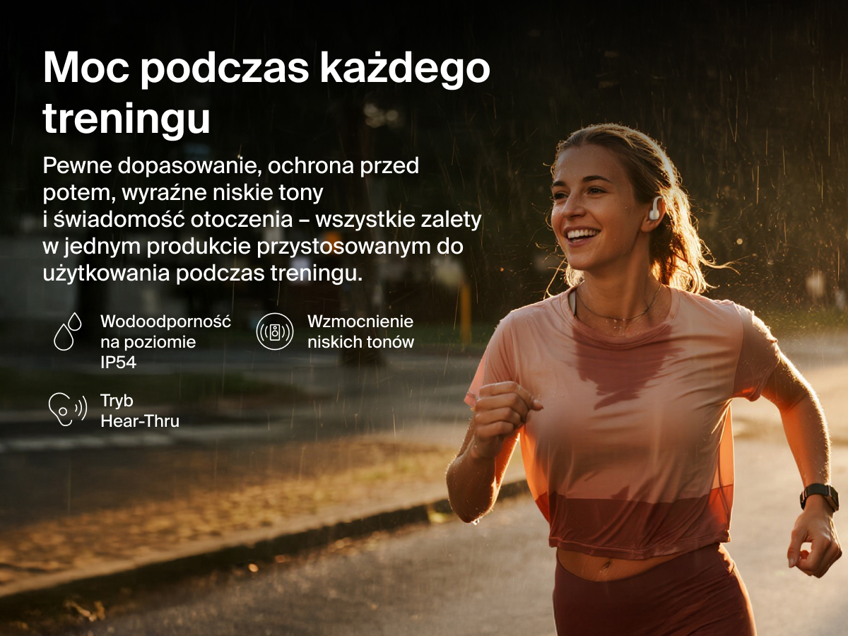 Certyfikat IP54 chroni słuchawki przed potem, kurzem i zachlapaniami. Dzięki temu słuchawki do biegania bluetooth sprawdzają się podczas treningów na świeżym powietrzu, aktywności miejskich oraz w codziennym użytkowaniu. W zestawie znajdują się trzy rozmiary silikonowych końcówek dousznych, które umożliwiają dopasowanie słuchawek do indywidualnego kształtu ucha i zwiększają komfort noszenia.
