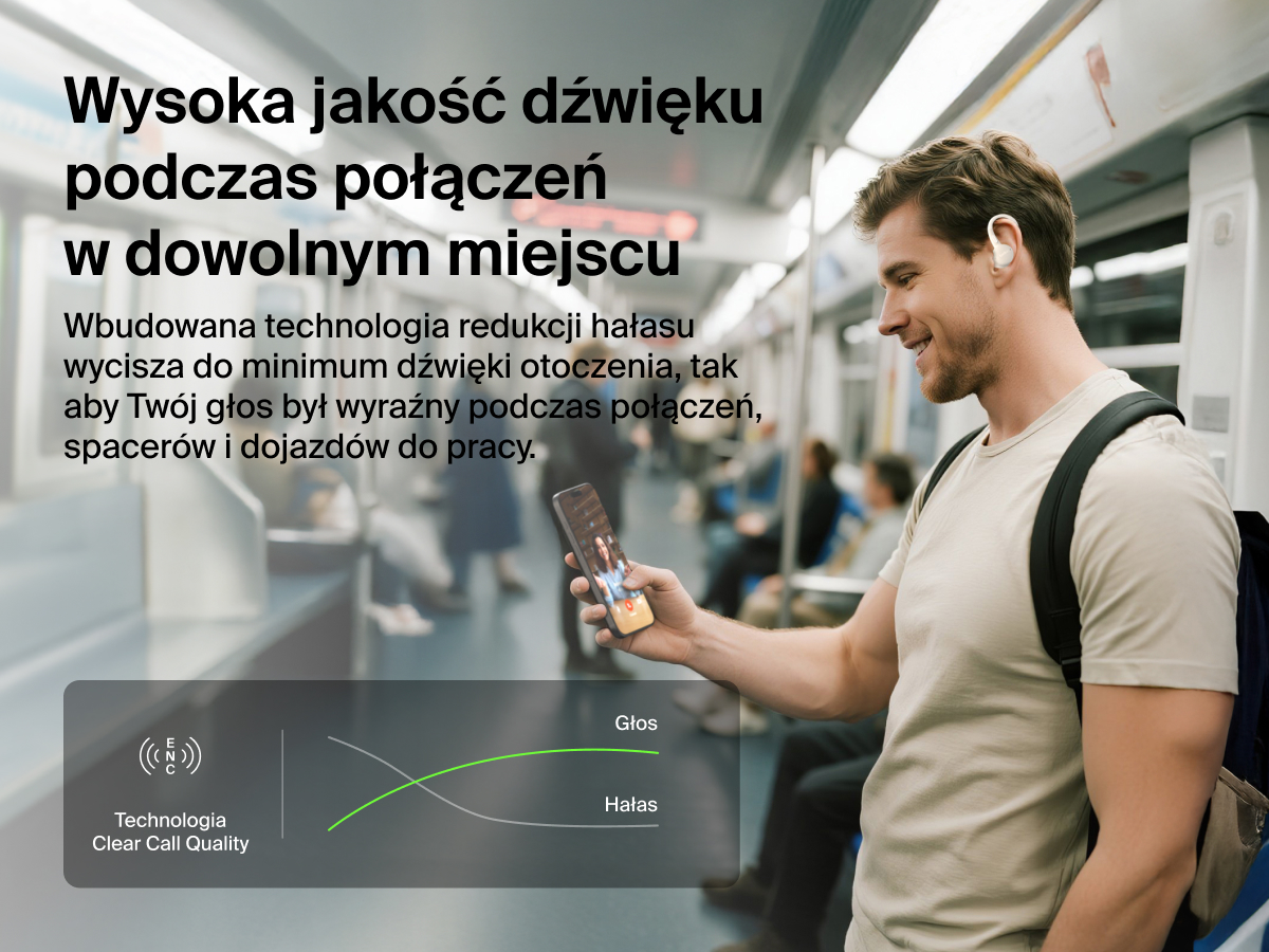 Wbudowane dwa mikrofony wykorzystują technologię ENC (Environmental Noise Cancellation), która ogranicza hałas otoczenia podczas rozmów. Dzięki temu słuchawki bluetooth z mikrofonem zapewniają czysty i wyraźny głos nawet w ruchliwym otoczeniu. To szczególnie ważne dla osób prowadzących rozmowy biznesowe w podróży, w coworkingu lub w trakcie codziennych aktywności.