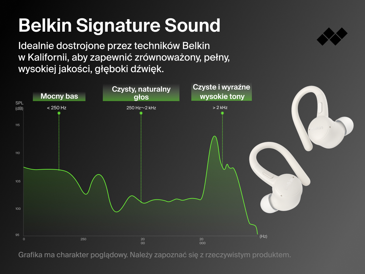 Przetworniki o średnicy 6 mm odpowiadają za zbalansowane brzmienie charakterystyczne dla Belkin Signature Sound. Dźwięk jest wyraźny, naturalny i dobrze dopasowany zarówno do muzyki, jak i podcastów czy rozmów. Dodatkowo trzy ustawienia korektora pozwalają dopasować charakter brzmienia do preferowanego stylu słuchania.