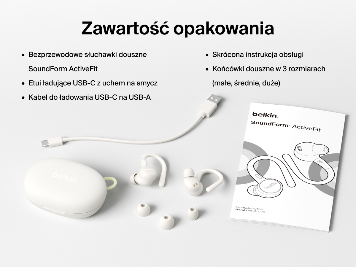 - Zawartość zestawu: bezprzewodowe słuchawki Belkin SoundForm ActiveFit, etui ładujące USB-C, trzy pary silikonowych końcówek dousznych (S, M, L), kabel USB-C do ładowania