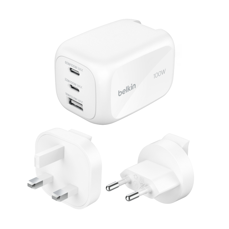 Belkin Ładowarka 100W GaN, 2x USB-C, USB-A, podróżna (EU, US, UK), biała