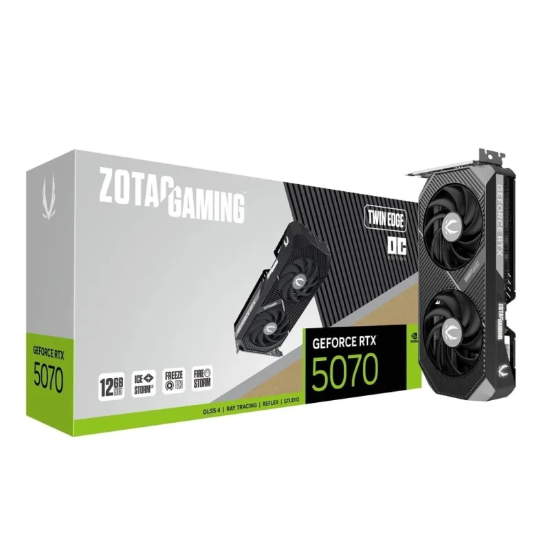 ZOTAC Karta graficzna GeForce RTX 5070 TWIN EDGE OC 12GB GDDR7 192bit ZOTAC Karta graficzna GeForce RTX 5070 TWIN EDGE OC 12GB GDDR7 192bit to karta graficzna z 12GB pamięci VRAM, oparty na chipsecie GeForce RTX 5070. Odpowiada za przetwarzanie grafiki w grach, aplikacjach 3D i multimediach.