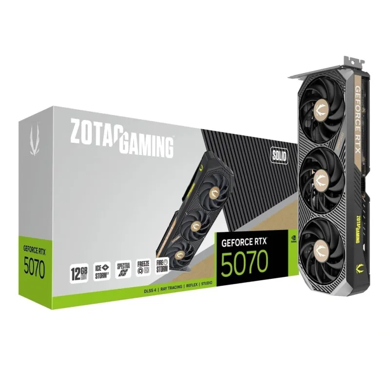 ZOTAC Karta graficzna GeForce RTX 5070 SOLID 12GB GDDR7 192bit 3DP/HDMI ZOTAC Karta graficzna GeForce RTX 5070 SOLID 12GB GDDR7 192bit 3DP/HDMI to karta graficzna z 12GB pamięci VRAM, oparty na chipsecie GeForce RTX 5070. Odpowiada za przetwarzanie grafiki w grach, aplikacjach 3D i multimediach.