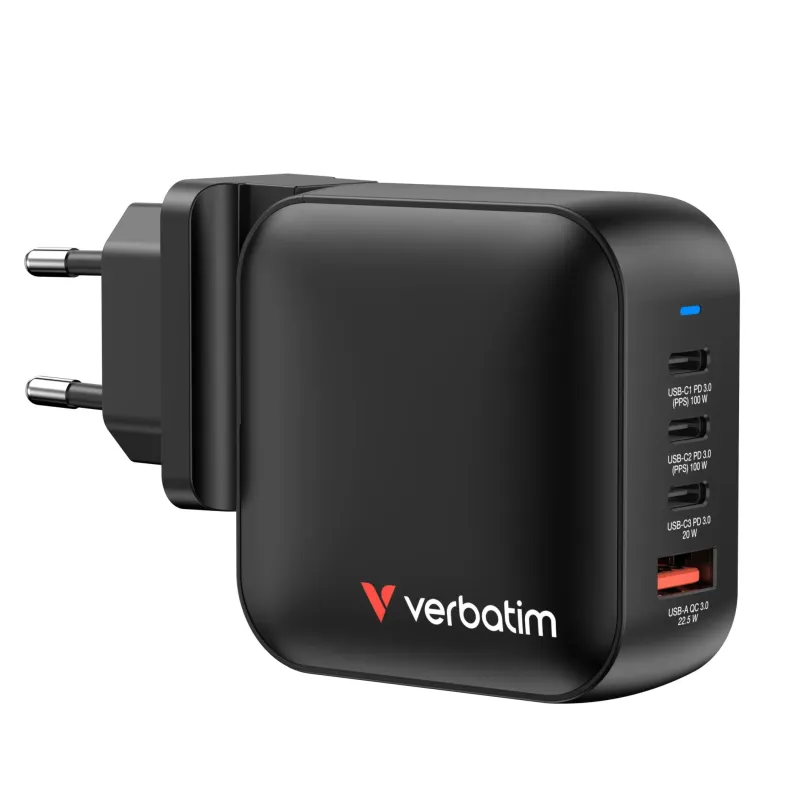 Ładowarka sieciowa Verbatim Mini GaN 100W 3xUSB-C PD 1xUSB-A QC 3.0 to ładowarka. Zapewnia szybkie i bezpieczne ładowanie urządzeń mobilnych.