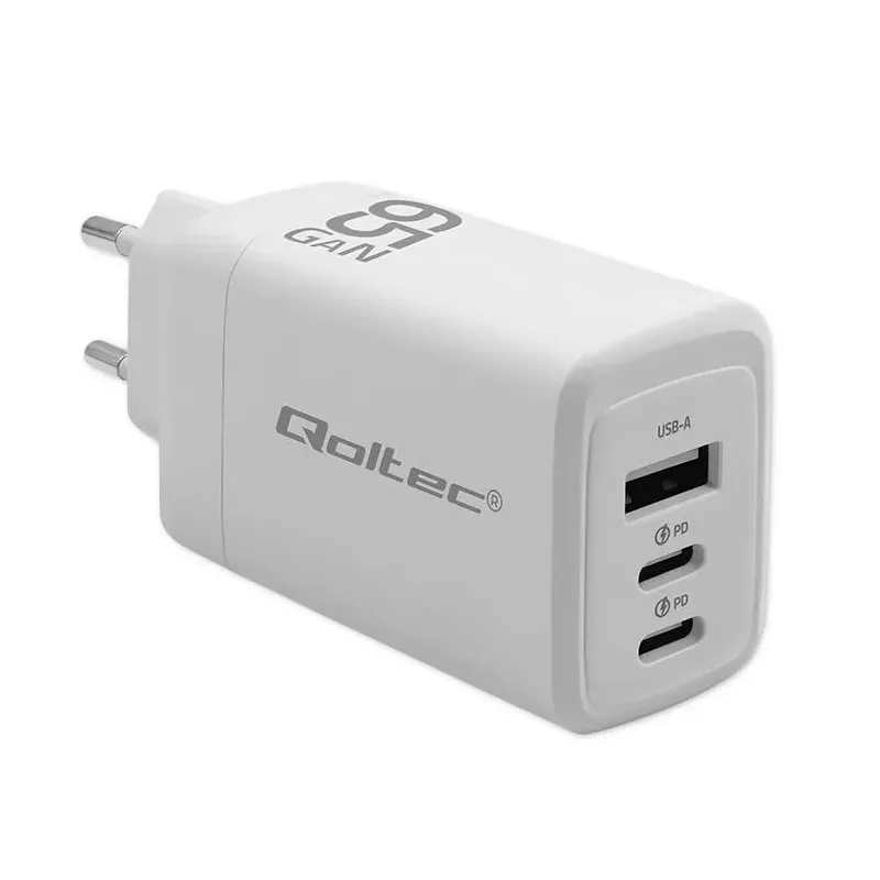 Ładowarka sieciowa Qoltec 65W GaN | 5-20V | 3-3.35A | 2xUSB-C PD | 1xUSB QC to ładowarka. Zapewnia szybkie i bezpieczne ładowanie urządzeń mobilnych.