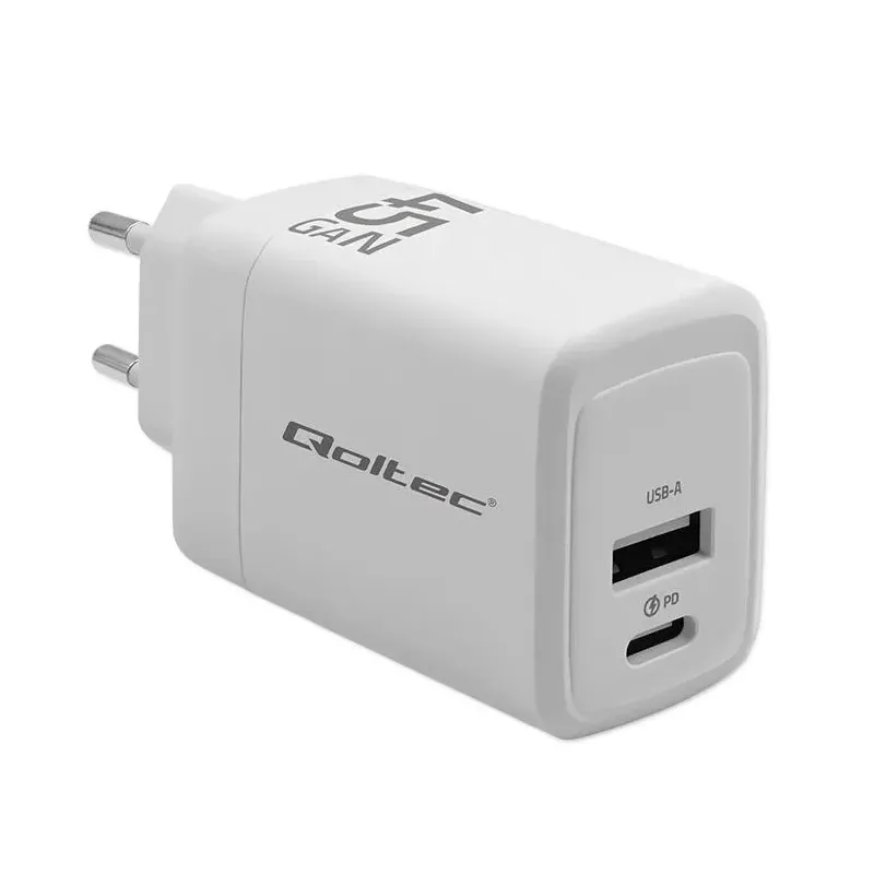 Ładowarka sieciowa Qoltec 45W GaN | 5-20V | 1.5-3A | 1xUSB-C PD | 1xUSB QC to ładowarka. Zapewnia szybkie i bezpieczne ładowanie urządzeń mobilnych.