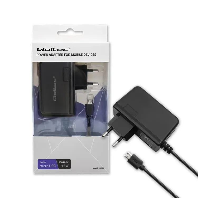 Ładowarka sieciowa Qoltec 15W | 5V | 3A | micro USB to ładowarka o długości 1.30 m. Zapewnia szybkie i bezpieczne ładowanie urządzeń mobilnych.