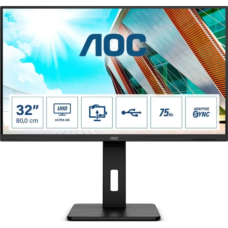 Monitor AOC 31,5" U32P2 2xHDMI DP 4xUSB 3.1 głośniki to monitor LCD z ekranem 31.50 cali, o rozdzielczości 3840 x 2160 (4K UHD). Zapewnia wysoką jakość obrazu do pracy biurowej i rozrywki.