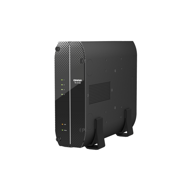 Profesjonalny serwer NAS TS-410E 2,5GbE jest przeznaczony do pracy w środowisku wrażliwym na hałas. Dzięki konstrukcji pozbawionej wentylatora i ponadprzeciętnie solidnej obudowie model TS-410E można ustawić pionowo w celu zaoszczędzenia miejsca. Dostępna jest także konfiguracja z pamięcią podręczną SSD zapewniająca szybkość transmisji wychodzącej i przychodzącej, dzięki której możliwe jest przyspieszenie pracy i wykraczanie poza oczekiwania wymagających zastosowań.