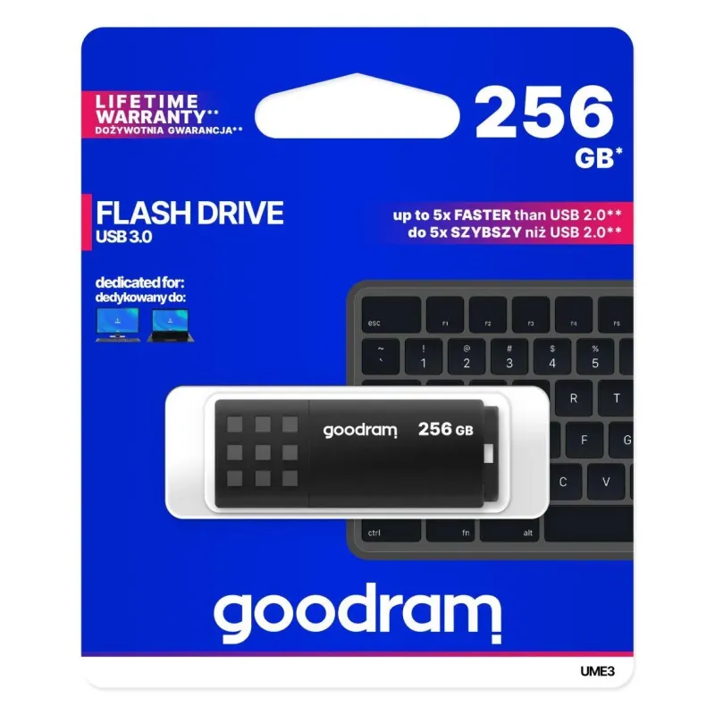 Pendrive GOODRAM 256GB UME3 USB 3.2 Gen 1 Black to pendrive o pojemności 256 GB, o taktowaniu nie dotyczy. Umożliwia szybkie przenoszenie plików między urządzeniami.