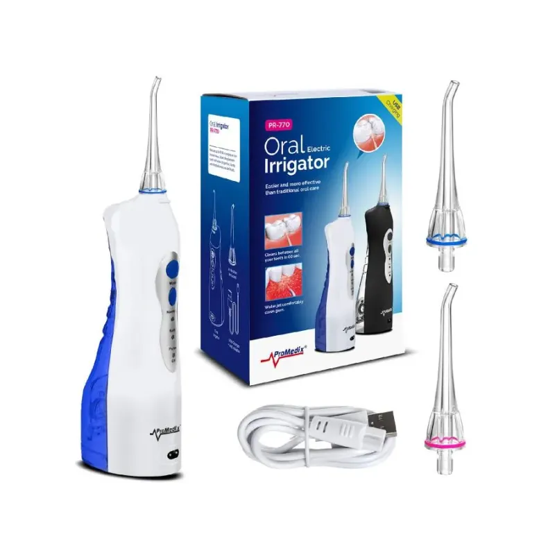 Czyści oraz masuje dziąsła, powodując lepsze ich ukrwienie a co za tym idzie poprawia ich ogólną kondycję Łatwość obsługi oraz silny strumień wody pozwalają utrzymać higienę jamy ustnej na najwyższym poziomie! Regulowana moc irygacji Opakowanie producenta Zasilacz: 100-240V 50/60Hz Zawartość opakowania: Irygator Promedix PR-770 2 końcówki Ładowarka Instrukcja obsługi 3 tryby pracy (delikatny, normalny, pulsujący) Siła strumienia do 8,5 Bar (72,5-123 Psi) Stopień ochrony IPX7 Materiał: ABS+PP(zbiornik) Pojemność zbiornika: 160 ml Zasilanie: Wbudowany akumulator NiMh