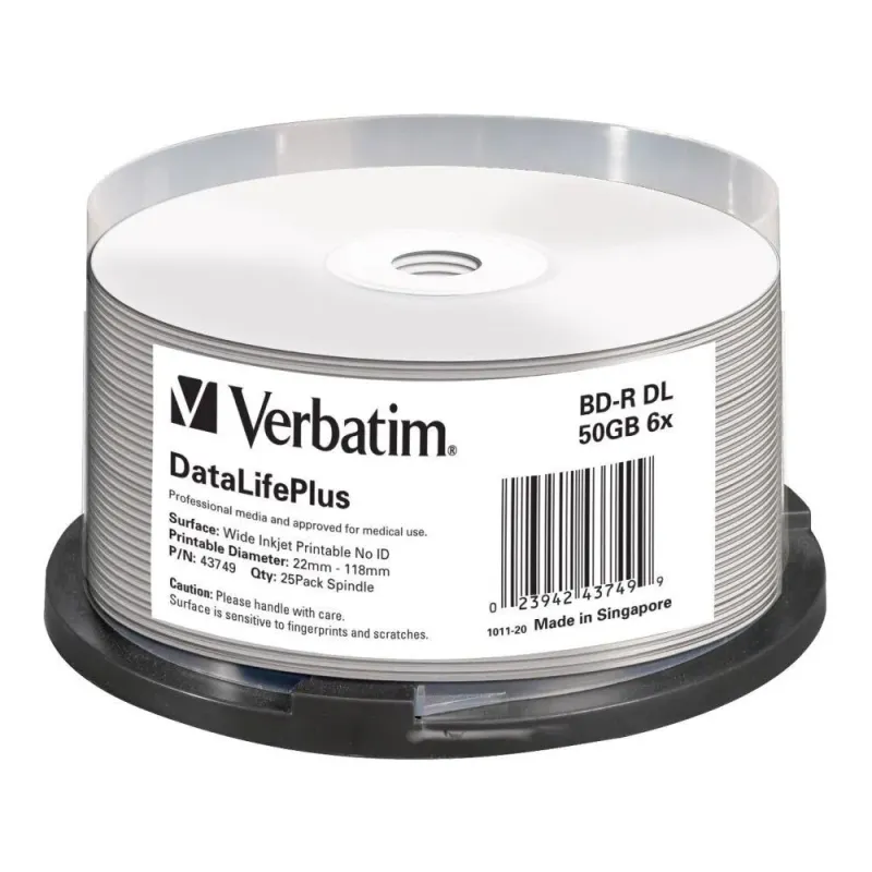 Płyty BD-R DL Verbatim 50GB 6x Wide Printable - No ID Brand (spindle 25) Płyty BD-R DL Verbatim 50GB 6x Wide Printable - No ID Brand (spindle 25) to płyta Blu-Ray. Oferuje dużą pojemność do archiwizacji danych i nagrywania filmów HD.