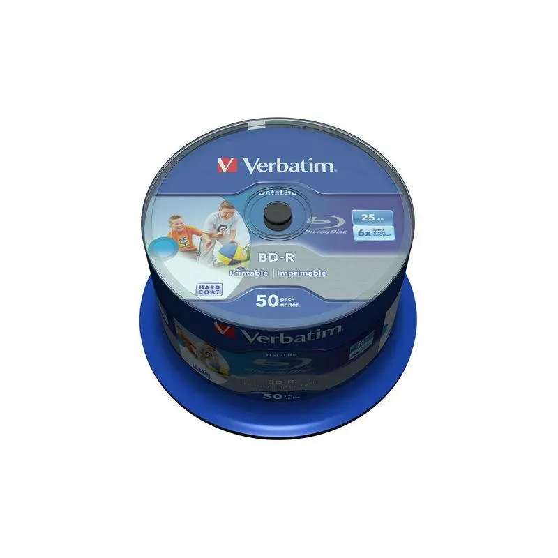 Płyty BD-R Verbatim 25GB X6 printable Datalife (Cake 50) to płyta Blu-Ray. Oferuje dużą pojemność do archiwizacji danych i nagrywania filmów HD.