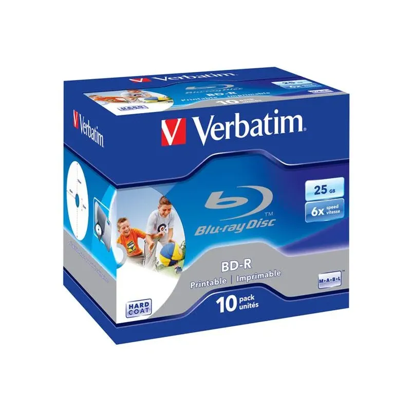 Płyty BD-R Verbatim 25GB X6 Printable (10 jewel case) to płyta Blu-Ray. Oferuje dużą pojemność do archiwizacji danych i nagrywania filmów HD.