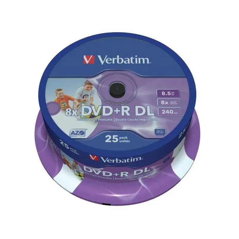 Płyty DVD+R DL Verbatim 8x 8.5GB (Cake 25) PRINTABLE to płyta DVD. Umożliwia archiwizację danych, tworzenie kopii zapasowych i nagrywanie multimediów.