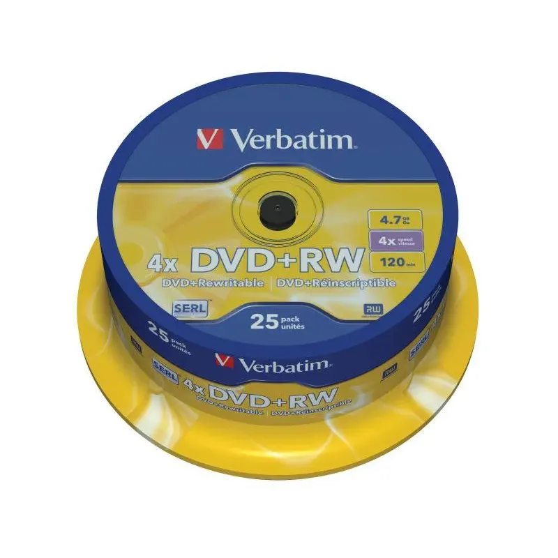 Płyty DVD+RW Verbatim 4x 4.7GB (Cake 25) MATT SILVER to płyta DVD-RW. Umożliwia wielokrotne nagrywanie i kasowanie danych.