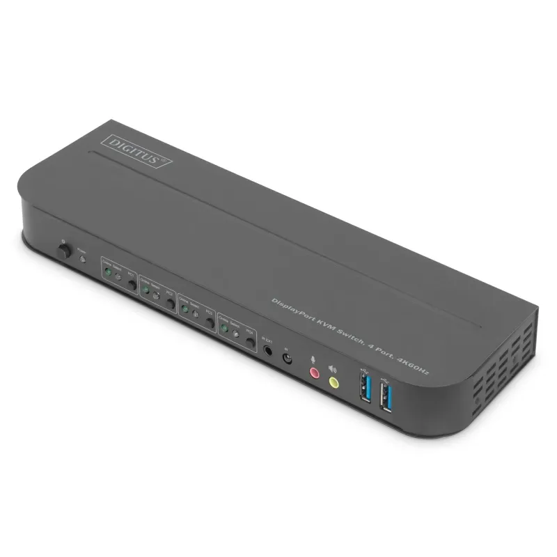 Przełącznik KVM DIGITUS 4 portowy DisplayPort do 1 port DP/HDMI 4K 60Hz to przełącznik KVM o rozdzielczości 4096 x 2160. Umożliwia sterowanie wieloma komputerami jednym zestawem klawiatury i myszy.