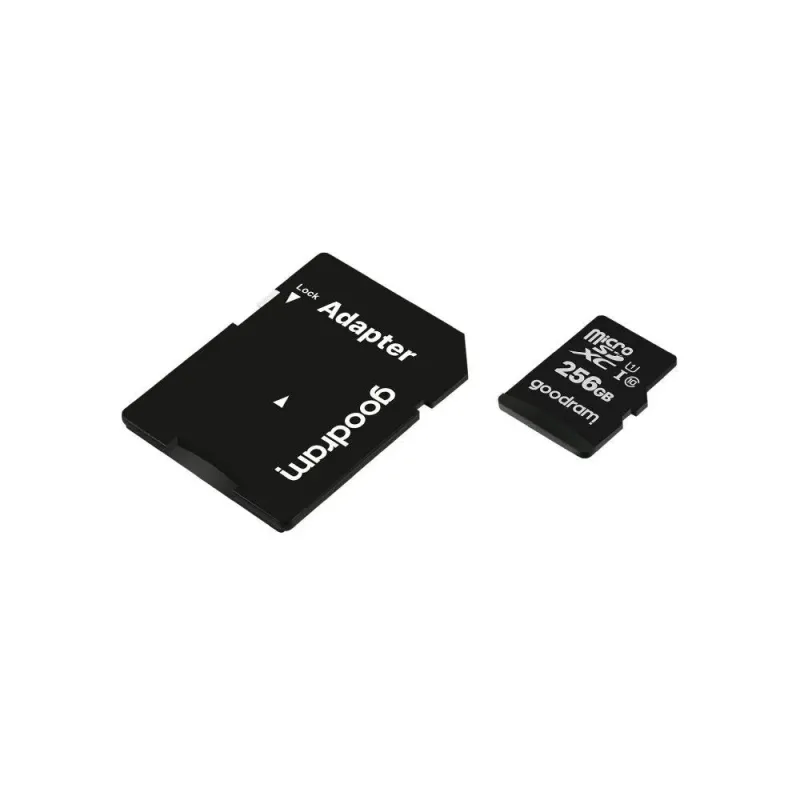 Karta pamięci microSDXC GOODRAM 256GB M1AA-2560R12 cl 10 UHS-I + adapter to karta pamięci SD o pojemności 256 GB, o taktowaniu nie dotyczy. Rozszerza pamięć aparatów, kamer i urządzeń mobilnych.