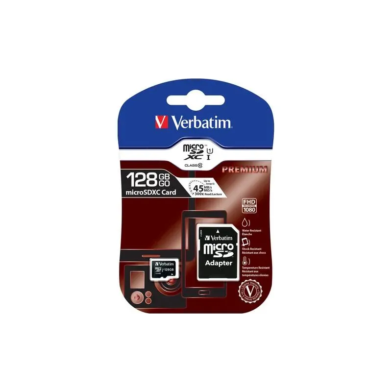Karta pamięci MicroSDXC Verbatim 128GB Class 10 + adapter to karta pamięci SD o pojemności 128 GB. Rozszerza pamięć aparatów, kamer i urządzeń mobilnych.