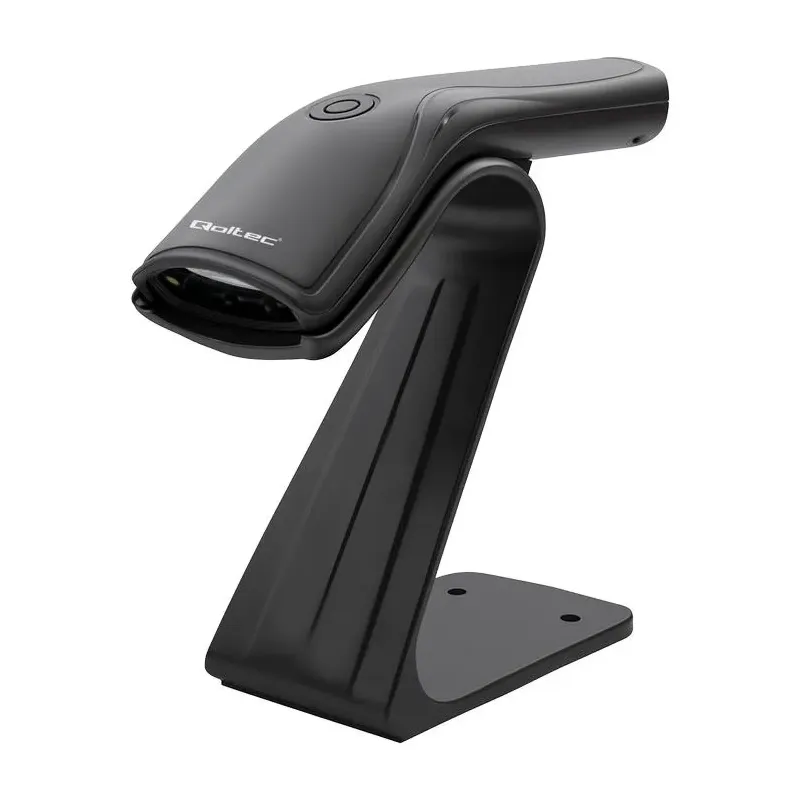 Czytnik kodów kreskowych Qoltec + stojak na skaner | 1D | USB to skaner kodów kreskowych. Odczytuje kody kreskowe i QR w handlu i magazynie.