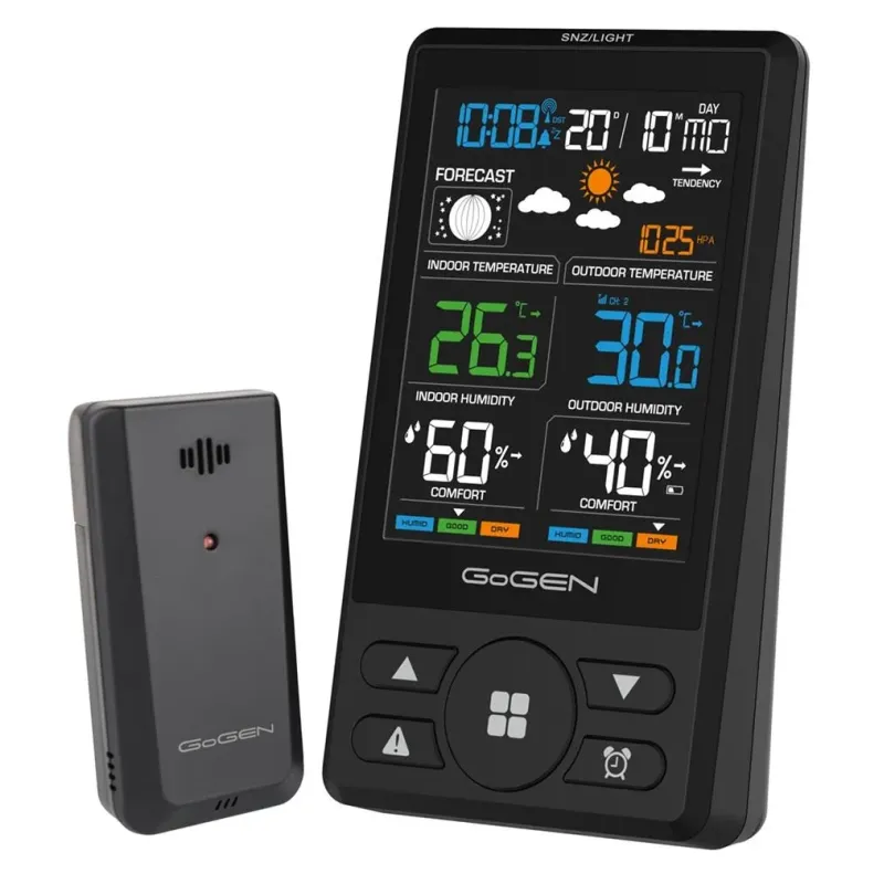 Stacja meteo Gogen – ME1250B to stacja pogodowa. Mierzy temperaturę, wilgotność i ciśnienie atmosferyczne.