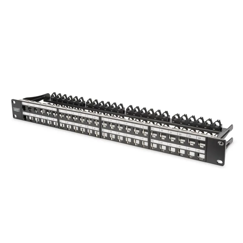 Patch panel pusty DIGITUS 19" 48 port 1U do modułów keystone (RAL 9005) to szafa serwerowa rack. Zapewnia bezpieczne przechowywanie i organizację sprzętu sieciowego.