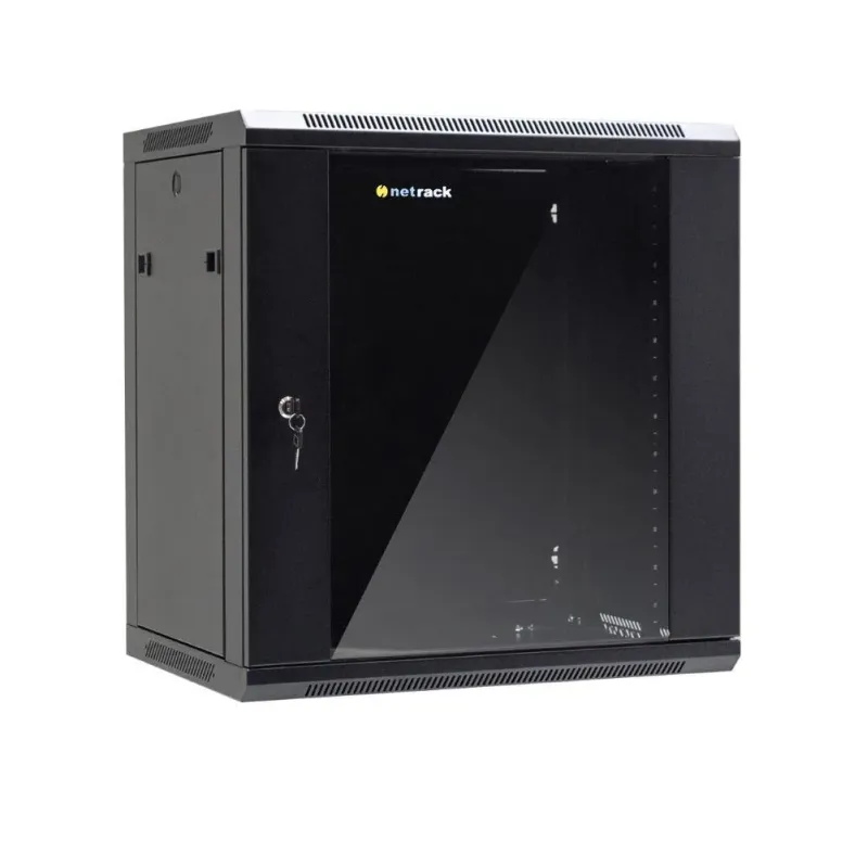 Szafa wisząca 19" Netrack, 12U/600x450mm - czarny, drzwi szklane, otwierane to szafa serwerowa rack. Zapewnia bezpieczne przechowywanie i organizację sprzętu sieciowego.