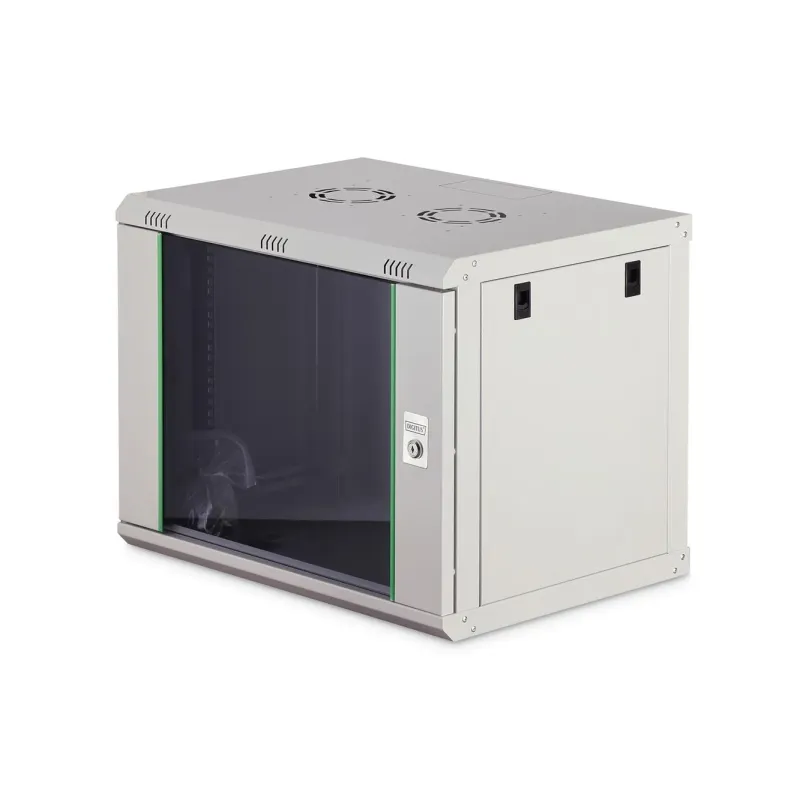 Szafa sieciowa wisząca jednosekcyjna DIGITUS Dynamic 19" 9U, 600x450, drzwi to szafa serwerowa rack. Zapewnia bezpieczne przechowywanie i organizację sprzętu sieciowego.
