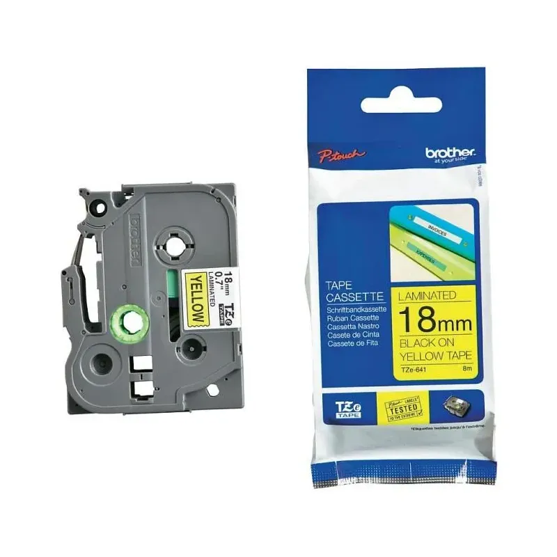 Taśma Brother P-Touch TZe-641 18mm x 8m (TZE641) - żółta, czarny nadruk to tasiemka do drukarki. Materiał eksploatacyjny do drukarek igłowych i etykiet.