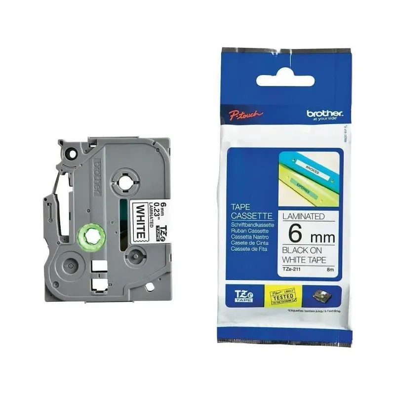 Taśma Brother P-Touch TZe-211 6mm x 8m (TZE211) - biała, czarny nadruk to tasiemka do drukarki. Materiał eksploatacyjny do drukarek igłowych i etykiet.