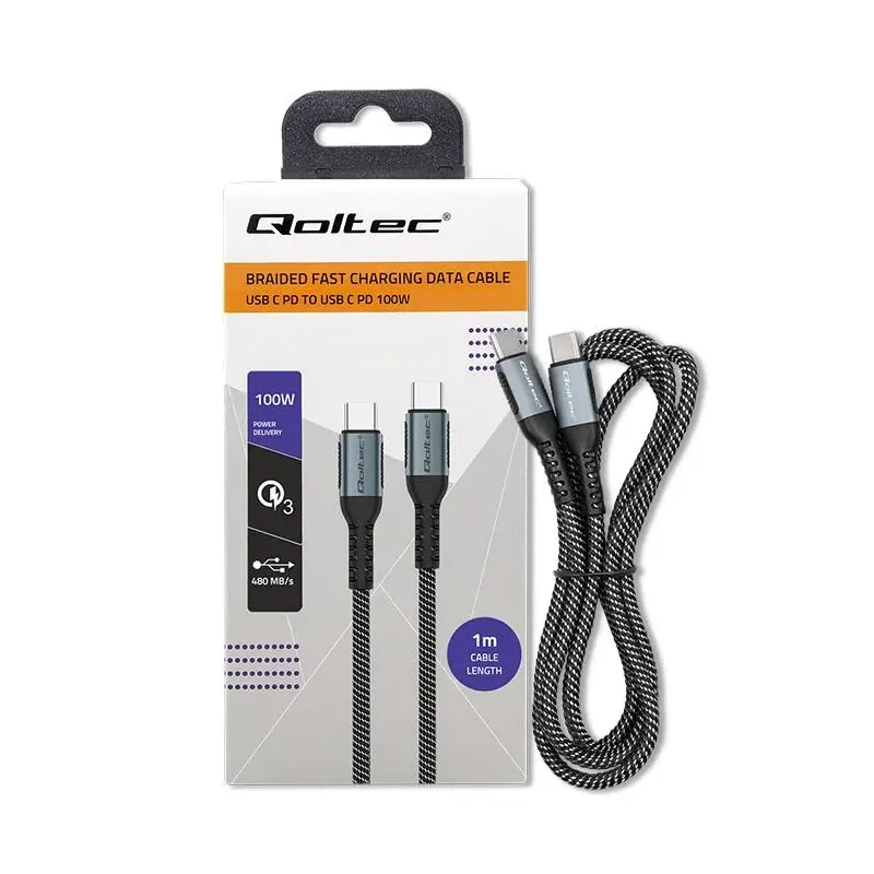 Kabel USB Qoltec 2.0 typ C | USB 2.0 typ C 100W| QC 3.0 | PD | 1m | Czarny to kabel USB o długości 1.00 m. Umożliwia podłączenie i transfer danych między urządzeniami.