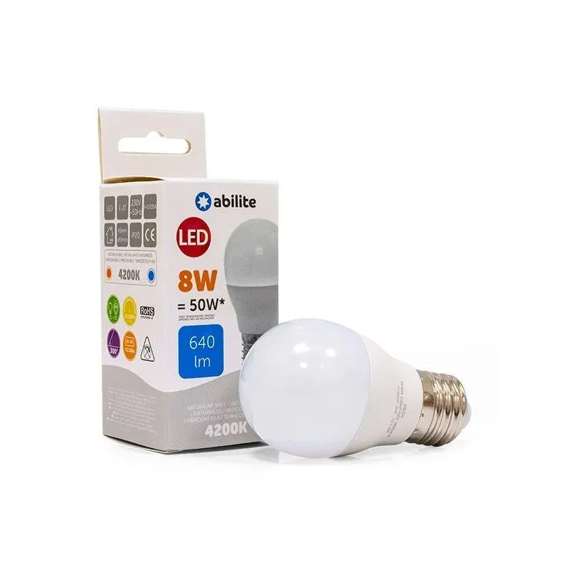 Żarówka LED Abilite kulka mleczna b.neutralna E27 8W/230V 640lm G45 to żarówka LED. Energooszczędne źródło światła.