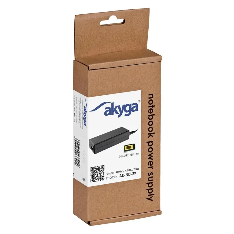 Zasilacz sieciowy Akyga AK-ND-29 do notebooka 20V/4,5A 90W Square yellow to zasilacz do laptopa o długości 1.20 m. Zapewnia zasilanie laptopa i ładowanie jego akumulatora.