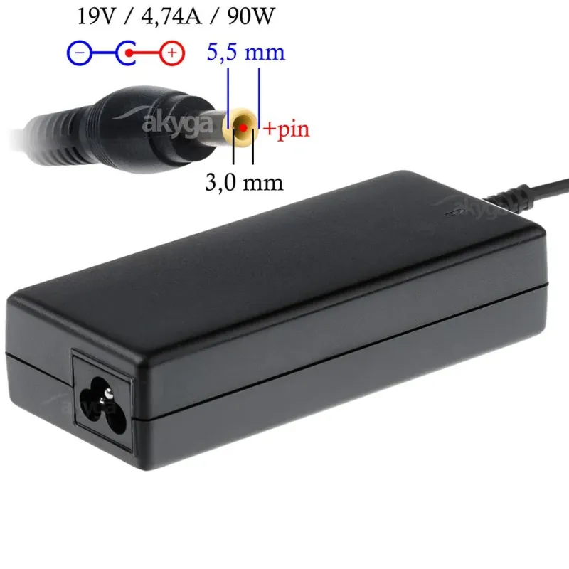 Zasilacz sieciowy Akyga AK-ND-27 do notebooka 19V/4,74A 90W 5.5x3.0mm + pin to zasilacz do laptopa o długości 1.20 m. Zapewnia zasilanie laptopa i ładowanie jego akumulatora.