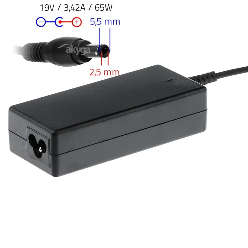 Zasilacz sieciowy Akyga AK-ND-01 do notebooka 19V/3,42A 65W 5.5x2.5 mm to zasilacz do laptopa o długości 1.20 m. Zapewnia zasilanie laptopa i ładowanie jego akumulatora.