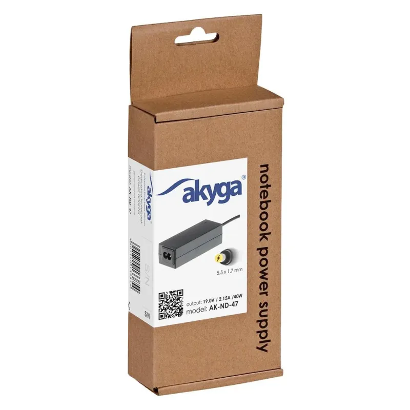 Zasilacz sieciowy Akyga AK-ND-47 do notebooka 19V/2,15A 40W 5.5x1.7 mm to zasilacz do laptopa o długości 1.20 m. Zapewnia zasilanie laptopa i ładowanie jego akumulatora.