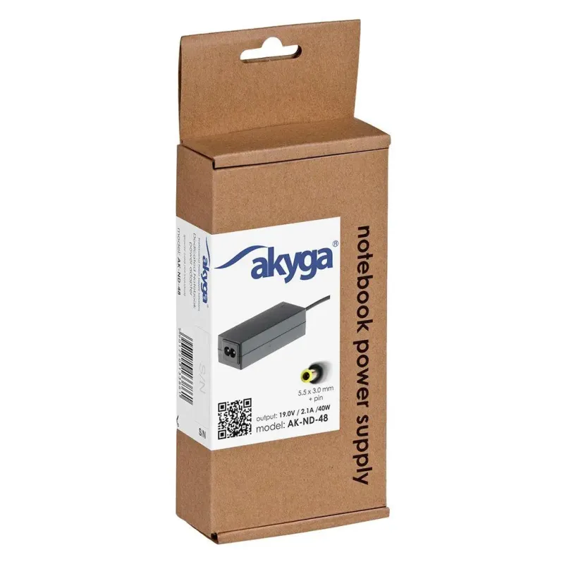 Zasilacz sieciowy Akyga AK-ND-48 do notebooka 19V/2,1A 40W 5.5x3.0 mm to zasilacz do laptopa o długości 1.20 m. Zapewnia zasilanie laptopa i ładowanie jego akumulatora.